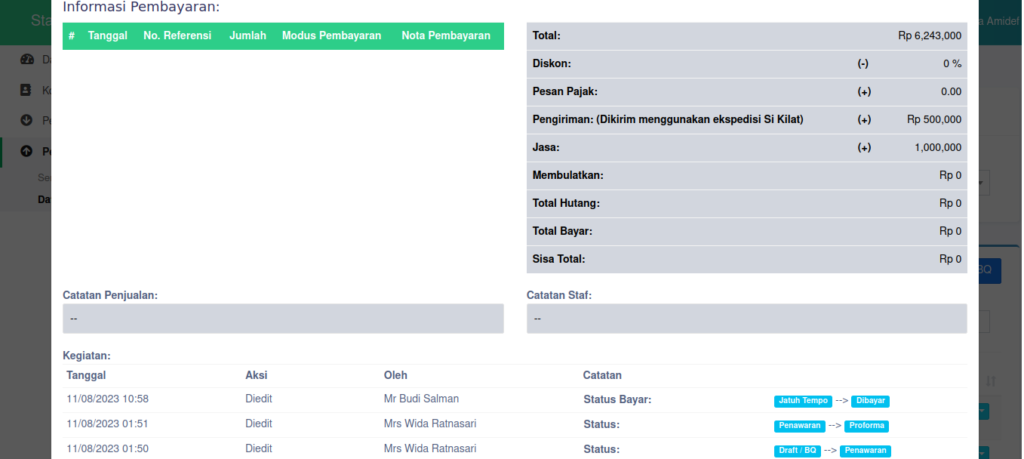 sampe proses ini dilakukan, maka Finance bisa melihat daftar transaksi di menu Semua Penjualan, dan di tombol akses, Bagian finance bisa melakukan transaksi pembayaran untuk material yang sudah di kirimkan ke tujuan pemesanan