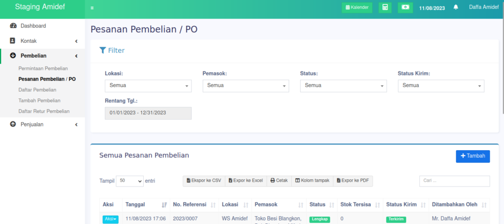 Pilih Menu Pesanan Pembelian / PO, klik tambah, lalu