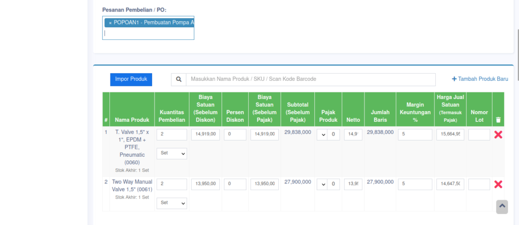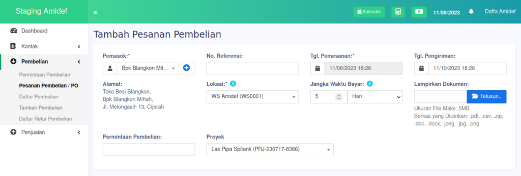 Apabila Data Pemasok tersebut sudah sesuai, maka akan muncul data Projek di form Pesanan Pembelian / PO di bagian dibawah, lalu dipilih Nama Projek / Kode Pesanan Pembelian PO yang muncul