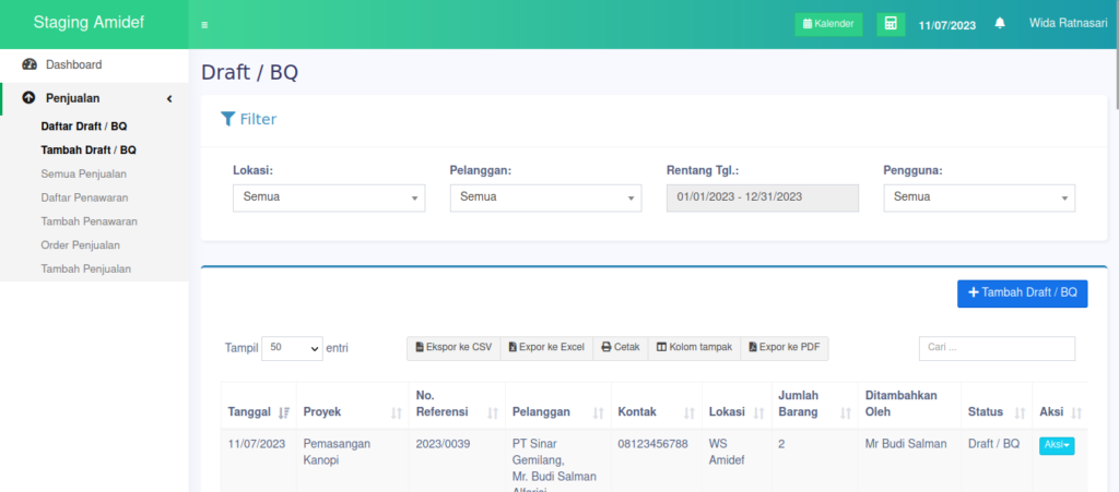 Modul Drafter berisi data2 dokumen BQ yang dibuat oleh divisi drafter, dengan status dokumen yang dirubah oleh bagian marketing.