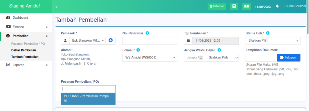 Untuk memproses Pembelian PO Material yang dilakukan oleh tim Purchasing, Admin Finance melakukan check menu Pesanan Pembelian / PO yang statusnya dipesan dan memastikan toko /pemasok mana yang di Order, lalu kemudian dengan memilih menu Tambah Pembelian dan menginputkan nama toko Material/nama Pemasok tersebut ke dalam Form Pemasok