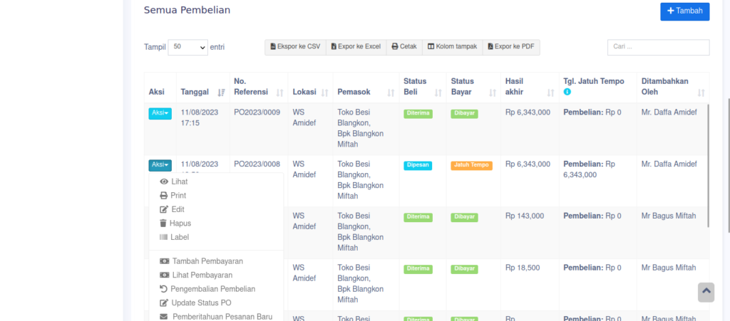 klik menu Tambah Pembayaran, lalu selesaikan pembayaran dan merubah status material dari dipesan menjadi diterima, proses ini dilaukan oleh pihak purchasing sebagai pembuat PO