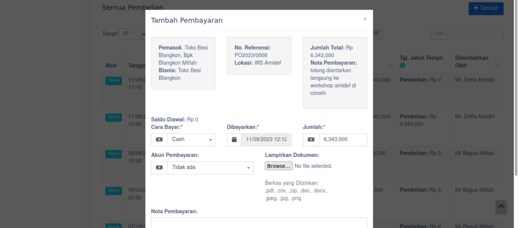 Setelah nama Projek dipilih di form Pembelian / PO , selanjutnya daftar Material yang dipesan akan muncul di bagian bawah, dan pihak Keuangan bisa menambahkan Pembayaran, atau bisa juga dilakukan belakangan