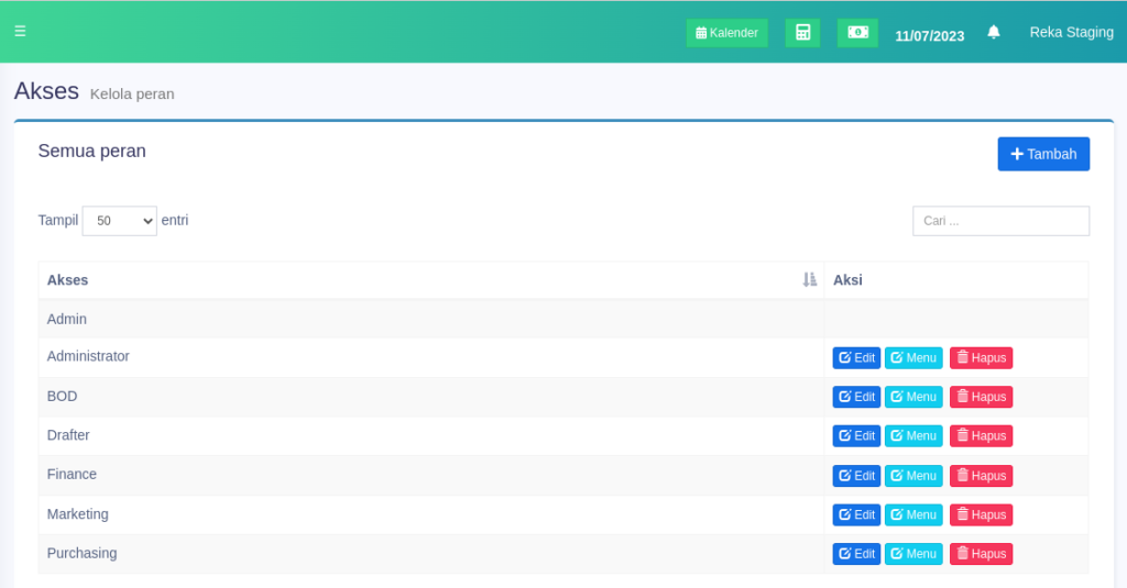 1. Modul Pengguna, Akses/Privilege dan Pengaturan Menu yang mengatur akses pengguna ke Menu berdasarkan Divisi/Bagian dan juga Pengaturan Menu dengan fitur drag drop