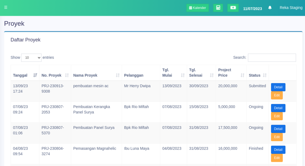 4. Modul Proyek, yang berisi Daftar Proyek yang sedang berlangsung. Modul Projek ini berisi detail dari sebuah projek yang sedang dijalankan oleh Amidef, yang berisi Nama projek, Client/Pelanggan, Tanggal di mulai dan tanggal batas waktu penyelesaian Projek, Nilai dari Projek, Status, Scopes, dan issue yang harus di isi untuk informasi kepada BOD